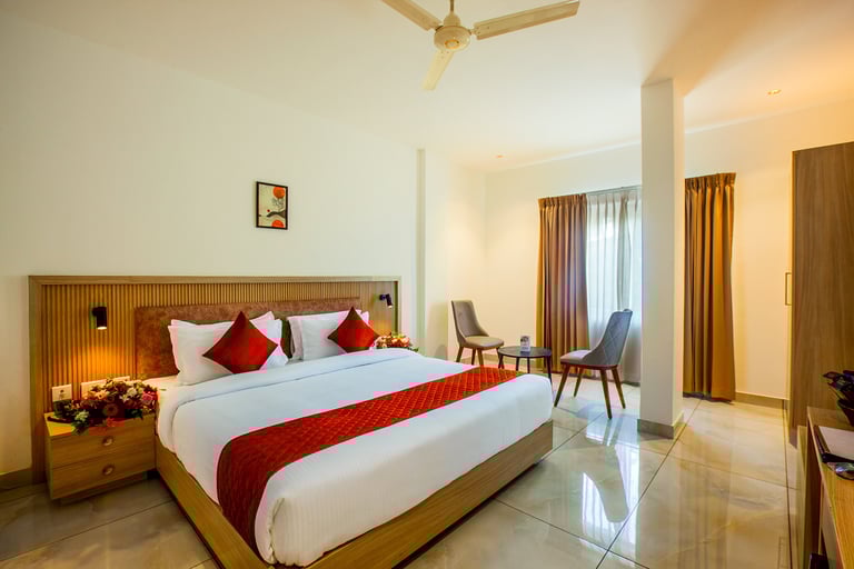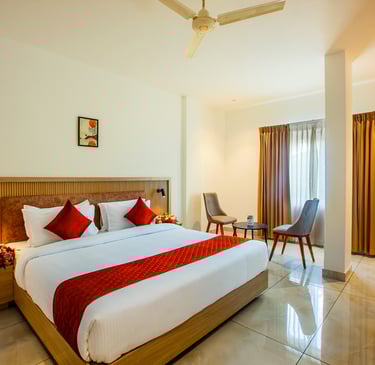 Amity Heights offers a selection of Deluxe and Standard Rooms designed to provide the perfect blend of style and convenience. Each category—available in both Single and Double Occupancy—is thoughtfully furnished with modern amenities, plush bedding, and serene interiors that reflect sophistication. The large windows open to refreshing views of the Balussery’s landscape, allowing guests to wake up to sunlight filtering through the greenery and the soothing whispers of nature. The spacious design, tastefully decorated interiors, and gentle lighting create an ambiance that instantly makes you feel at ease